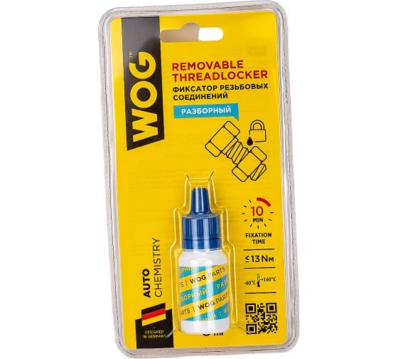 Анаэробный герметик-фиксатор резьбовых соединений WOG 9 мл WGC0725 применяется для надежной фиксации и герметизации резьбовых и вал-втулочных соединений, упрощает ремонт и повышает качество сборки. Предотвращает самопроизвольное отвинчивание, коррозию и утечки технических жидкостей. Устойчив к ГСМ, газу, воде. Применяется для резьбы от М5 до М20.