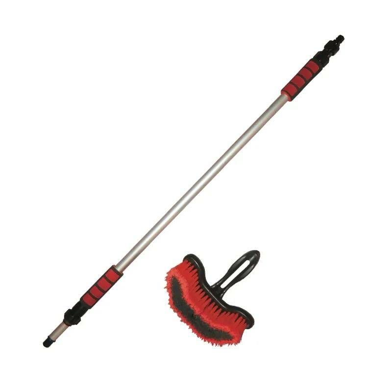 Телескопическая щетка для мытья автомобиля. Оснащена насадкой для подключения к шлангу и краном для подачи воды. Мягкая, распушенная щетина для деликатного мытья автомобиля.