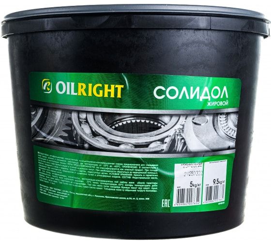 Жировой солидол OILRIGHT 5 кг рекомендован для смазывания и консервации узлов трения, качения и скольжения, может применяться как для открытых, так и для закрытых узлов, с использованием ручных солидолонагнетателей при температуре до -20°C. Обладает сильными вязкостно-температурными свойствами, меньше уплотняется при хранении, а также тиксотропно не упрочняется при отдыхе после разрушения. Температурный интервал применения – до +65°C